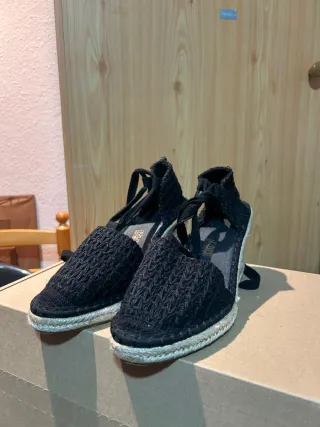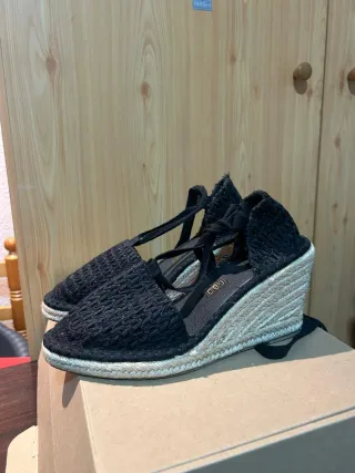 Sandalias de cuña con un diseño tejido. Color negro. - Cierre con tiras. - Plataforma de esparto.