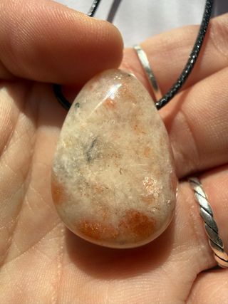 Precioso colgante de Piedra Sol natural (Heliolita) con un acabado pulido impecable. Tiene unos destellos anaranjados preciosos bajo la luz del sol. Es la piedra de la alegría y la energía positiva por excelencia. Una pieza sencilla, elegante y con una vibración increíble. ¡Perfecta para regalo o para uso diario! Viene con su cordón a juego ajustable.