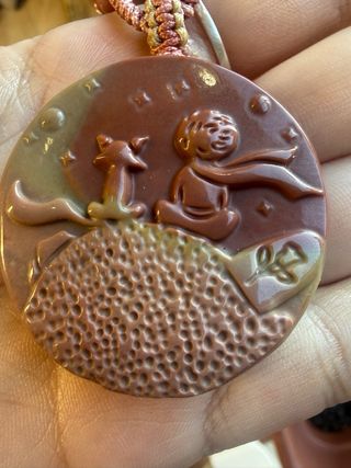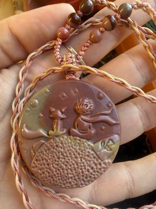 ✨ Pieza única de coleccionista. Precioso colgante tallado a mano en Ágata Alashan natural, con una detallada escena de "El Principito" y su zorro contemplando las estrellas desde su asteroide. La piedra presenta unos tonos tierra y pasteles naturales preciosos, con un relieve táctil muy detallado en la superficie que simula el suelo lunar. • Ágata Alashan 100% natural (procedente del desierto de Gobi, Mongolia). • Estado: Impecable, nuevo. • Incluye: Cordón artesanal trenzado de alta calidad con cierre ajustable. Ideal como regalo especial o para amantes de los minerales. Propiedades: Equilibrio y Estabilidad, Protección.