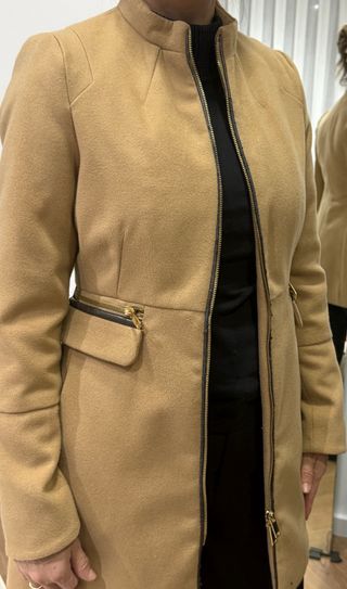 Abrigo estilo Stradivarius en color camel. Presenta un diseño moderno con detalles de cremallera. - Cuello alto. - Cierre central de cremallera. - Bolsillos frontales con cremallera.