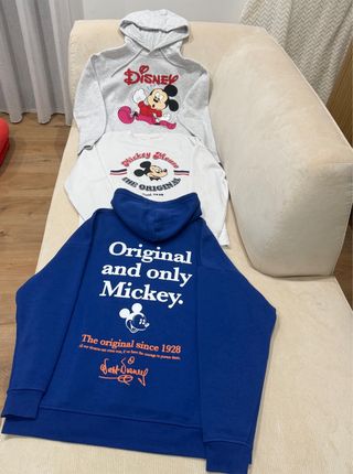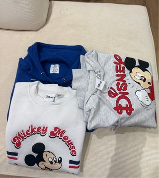 Conjunto de tres sudaderas con temática de Mickey Mouse. - Una sudadera azul. - Una sudadera gris. - Una sudadera blanca con diseño de Mickey Mouse. Talla XS, pero tallan como una S El precio es por el lote de tres