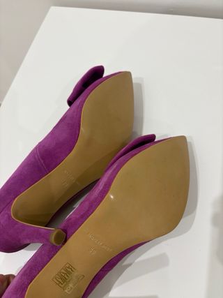 Elegantes zapatos de salón Nuria Cobo en color bugambilla. - Material de ante. - Adorno de lazo en la punta. - Diseño de punta fina.