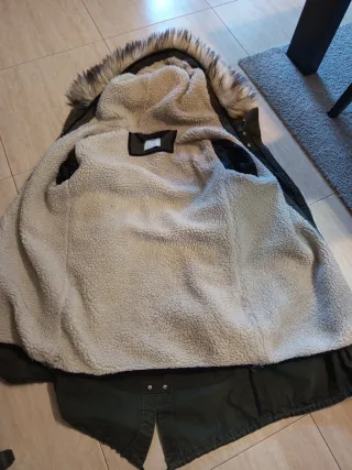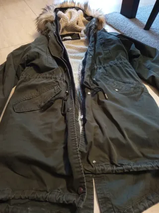 Abrigo de estilo parka con forro interior cálido y capucha. - Cierre de cremallera. - Cordón ajustable en la cintura. - Bolsillos frontales con solapa. - Puños ajustables.