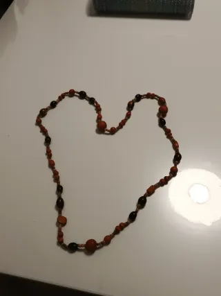 Collar artesanal con cuentas de madera de diferentes tamaños y formas. - Cuentas de madera en tonos marrones y anaranjados. - Cordón resistente para ensartar las cuentas.