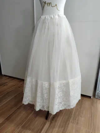 Cancán vuelo para aportar volumen y movimiento a los vestidos de Primera Comunión. Cintura ajustable según necesidad, con goma y botón. Talla 120.(Desde la cinturilla hasta abajo mide 85cm), fue usado para vestido Comunión niña 9 años.