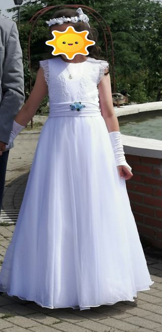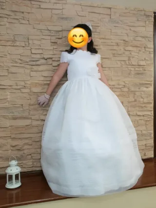 Vestido de comunión elegante, ideal para un día especial. Bonito vestido hecho a medida con cancán incorporado, en color blanco puro. El precio incluye la corona, los guantes y otro cancán. Además, regalo una faja con detalles azules, hecha aparte. El vestido se encuentra en perfecto estado, puesto solo una vez. Todo se entregará limpio y se puede ver sin compromiso. El vestido esta para una altura de 140cm, otras medidas en una de las fotos. Zona Vicálvaro