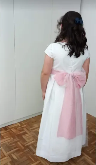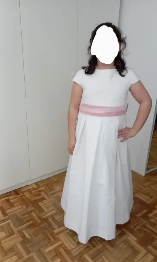 Vestido de comunión blanco con lazo de gasa rosa empolvado. Lleva cancan de vuelo bajo. Muy cómodo de poner y llevar. Pecho: 83,5 cm Ancho hombros: 34cm Largo: 120cm Tengo zapatos blancos talla 36 en mi galeria. Por si interesa.