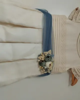 Vestido de comunión elegante y delicado. - Cuerpo con detalles de encaje y mangas cortas. - Fajín azul con detalle floral. - Falda amplia con pliegues y puntilla en el bajo. - 134 cm aproximadamente - se puede quitar el lazo azul - también tengo el arreglo del pelo más los guantes