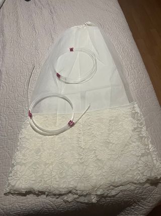 cancán para dar volumen a vestido, ideal para comuniones. - Tejido ligero y vaporoso. - Cintura elástica para mayor comodidad. - Aro extraíble para dar forma Solo tiene un uso, está en perfectas condiciones. Medidas: - contorno base 210cm - cintura 58cm - largo 82cm