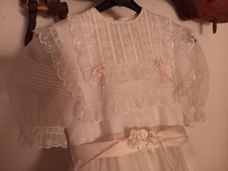 Vestido de comunión en perfecto estado. Medidas: Pecho: 34cm. Cintura: 35cm. Largo corpiño: 30cm. Largo falda: 84cm. Se vende con complementos: cancán, chal, guantes, flores para el pelo (a juego con las del vestido), rosario y libro "Mi primera comunión".