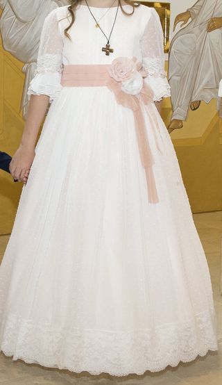 Vestido de comunión blanco con decoración en rosa. - Fajín rosa con flores decorativas. - Mangas abullonadas de plumeti y encaje. - Falda larga plumeti con puntilla en el bajo. Lo ha usado una niña bastante alta para su edad, usa la talla 12 e hizo la comunion con 10 años. Tiene bastante tela para sacar si está justo de talla. Recién lavado el tintorería. Incluye el cancán