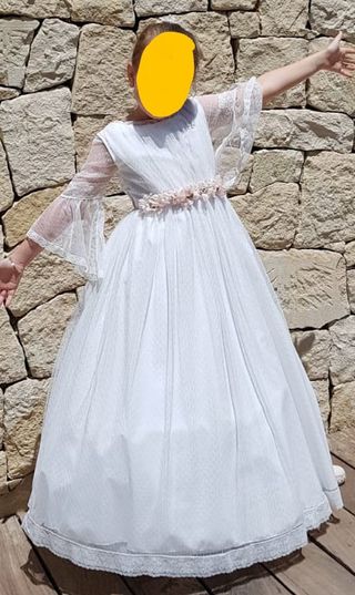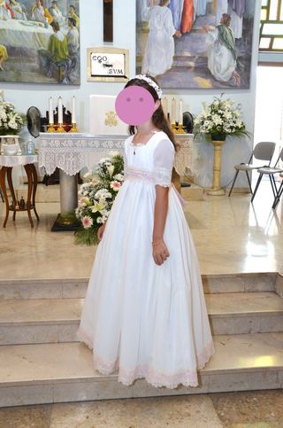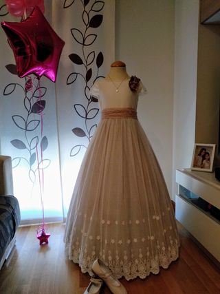 Precioso y original vestido de comunión. Comprado en el Corteinglés. Lleva adorno de flor en un hombro que se lo quité para limpiar en tintoreria, se puede volver a poner si se prefiere. Lazada rosa. La falda lleva por debajo capa de color arena. Queda muy bonito puesto. El adorno con flores del hombro puede llevarlo o no. Incluye cancán. Su precio era de 495 € cuando lo compré sin cancán.