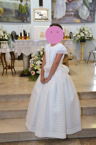 Vestido comunión impecable. Blanco roto muy sutil, con adornos de florecitas muy pequeñas en cuello, mangas, cintura y dos franjas en la falda. Cancan incluido y lazo de la cabeza haciendo juego con el de la cintura también. Medida de alto 1,10 de cintura 69 cm y de pecho 74 cm. Está en perfecto estado. Únicamente utilizado en la iglesia.