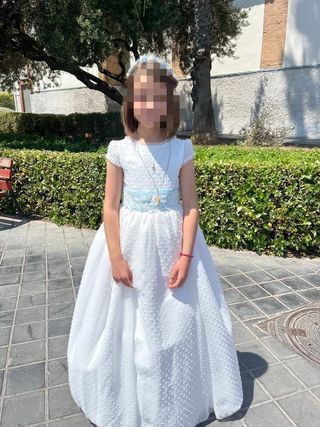 Vestido de comunión de la marca Coconut, en color blanco. Ideal para una ocasión especial. - Diseño elegante con detalles de encaje. - Cinturón gris perla. - Mangas cortas con volantes. - Falda amplia de tul. -Comprado en El Corte Inglés 480€ -Talla COCONUT 105 mide el vestido desde el tirante hasta el bajo del vestido 110 centímetros. -Cómodo y precioso. -Con una caída espectacular,y como se puede apreciar muy elegante. -Se regala can-can -También se regala capa marca COCONUT 49€ -Evidentemente solo una puesta. -Se entrega recién sacado de la tintorería,solo la tintorería nos costó 65€ -La fecha de compra fue en Febrero 2025