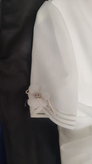 Precioso vestido de Primera Comunión de manga corta en perfecto estado. Incluye peineta de pelo con flor a juego con el vestido. Marca Tizzas, talla 120. Lo llevó mi hija de 9 años, mide aprox. 130 cm. Lo llevó durante aprox. 5 horas el día de su Comunión. Opción de adquirir la rebeca por 49€ más. No incluye cancán (mi hija lo llevó sin).