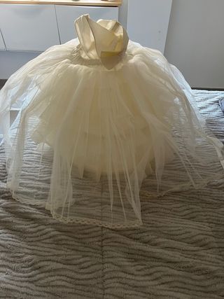 Fue un vestido que originalmente se confeccionó para una novia, pero salió pequeño y por eso se vendió como vestido de comunión para niña. La parte superior tiene un tono algo amarillento por el paso del tiempo (normal en encajes blancos).El bajo y las puntas están algo oscurecidas por el arrastre, con tintorería se soluciona. Faltan algunas piedras en la zona del pecho. Talla aprox para niña de unos 12 años. Ideal para comunión, sesión de fotos o para quien quiera dejarlo perfecto con un arreglo mínimo. Fue un vestido caro en su momento (600€). Precio negociable. (Se regalan guantes a juego)
