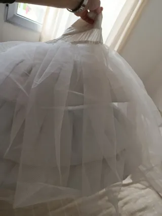 Precioso can can para niña, ideal para dar volumen a vestidos. Con aros y volantes. 6-9 años. Depende de la altura de la niña. 97 cm desde el tirante. Con tirantes para que no se les caiga. Un poco rozado. - Diseño de varias capas. - Volantes amplios. - Adorno de puntilla en el bajo.