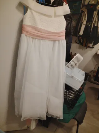 Vestido de comunión blanco con lazo de gasa rosa empolvado. Lleva cancan de vuelo bajo. Muy cómodo de poner y llevar. Pecho: 83,5 cm Ancho hombros: 34cm Largo: 120cm Tengo zapatos blancos talla 36 en mi galeria. Por si interesa.