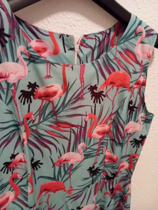 Vestido sin mangas con un vibrante estampado de flamencos y hojas tropicales. - Diseño llamativo con flamencos rosas y hojas en tonos verdes y morados. - Corte favorecedor que se ajusta en la cintura y cae con vuelo. - Ideal para eventos informales o para añadir un toque divertido a tu armario. - Añádele un cancán debajo y hazlo estilo años 50.