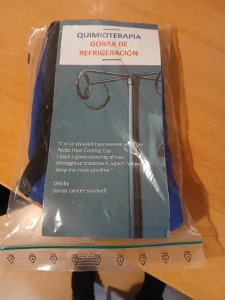 Gorro de refrigeración para quimioterapia, diseñado para ayudar a minimizar la pérdida de cabello. -Dispongo de 4 unidades, juntas o por separado - Marca: Arctic Heat. - Colores: Negro y azul. - Ayuda a mantener el cuero cabelludo fresco durante el tratamiento. - Testimonio de usuaria: Estoy muy contenta de haber perseverado con el Gorro de Refrigeración Arctic Heat. Mantuve una buena cobertura de cabello durante el tratamiento, lo que me ayudó a mantenerme más positiva. - Debby (superviviente de cáncer de mama).