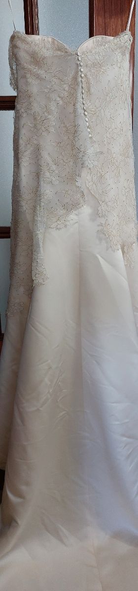 Usado solo una vez para vestido novia corte princesa y llevado a tintorería. Es de neopreno, por lo que se adapta muy bien. Es una talla 38, aunque me metieron pinzas que se pueden sacar. Largo de 97 cm y ancho 66-67 cm. Termina con un encaje. Está el aro (si se quiere se puede quitar)