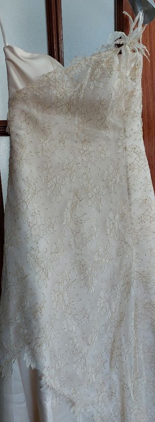 Vestido de novia. Como es normal de un día. Me costo muy caro. Y es muy bonito. Estado perfecto. Talla sobre unas 38 o un pelin más. Alta costura. Muy elegante y fino. Blanco roto. Me costo 3000 euros . Tiene cancan y velo. Un planchado y como nuevoooo