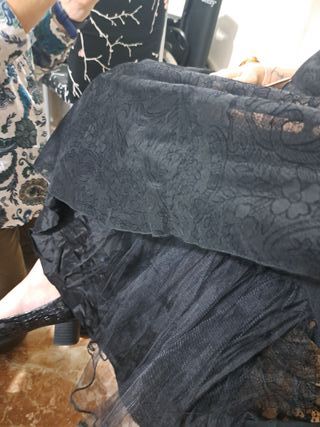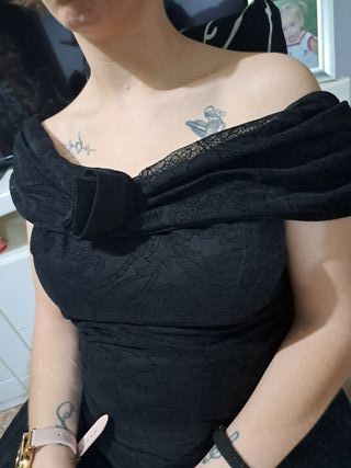 Vestido de cuello de barco, media pierna...de encaje Negro, de muy buena calidad, la falda es de nejas y tiene un cancan de nailon para despegar