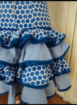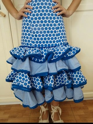 Precioso traje de gitana de la marca flamenca Ubaldo, de Huelva. Es entallado tipo sirena con cuatro costuras para entallar más o hacerlo más amplio y con escote de pico que se ajusta con cordón y cierra con gran cremallera de 50 cm, además tiene pequeñas mangas de farol con volantitos rizados elásticos. Lleva varios volantes en los bajos tanto de la tela de lunares del vestido como de tira bordada y tul con cancán para dar volumen. Talla 38-40. Medidas: largo 150, de sisa a sisa 48 cm, ancho hombros 42 que se amplia a 50 con mangas, cadera 48 cm. Muy fresquito, alegre y elegante. Apenas usado, limpio y sin defectos.