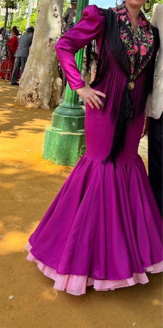 Vestido de flamenca en color buganvilla, confeccionado con tela un poco elástica, permite ir al baño sin dificultad. 2 años de antigüedad. - Falda con un volante grande y buen cancán interior que le da cuerpo a la falda. - Escote triangular, mangas abullonadas y sin volantes, muy cómodo. - Bolsillo interior. Lo vendo porque me quiero hacer uno a juego.