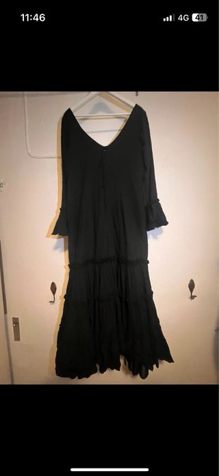 Traje flamenca negro de corte canastero con 3 volantes Manga larga con 1 volante Hecho de plumeti de algodón negro Enagua negra tipo cancán No pesa Muy fresquito Moda flamenca Serrano Taguas Buen estado Talla 52, con arreglos pero aún con tela para sacar Medidas Pecho 96 Cintura ( lo mas estrecho) 94 Cadera ( lo mas ancho) 121 Tiene unos 8/10 ctrs en cada costado para sacar y en la pinza del pecho 2/3 o