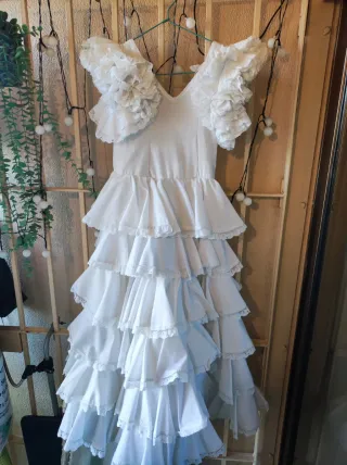 Traje de flamenca de popelín blanco hecho por modista con volantes de capa desde la cintura y remate de puntilla blanca en cada uno. Precioso. Manga de clavel y escote por delante y por detrás. Bajobilante de cancán. Puestos dos días. Color y tela en perfecto estado. Se puede probar. Tiene para sacar. Puede dar talla desde 6 a 8 años. Es divino. Largo del hombro al suelo 1,09 cms. Ancho de sisa a sisa 31 cms. Tiene para sacar.