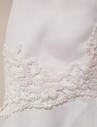 Elegante vestido de novia TRAZA estilo clásico, en raso, especial por la falda abotonada hasta el final; de escote deep-plunge, espalda en V y tirantes. Look Luna Novias de ensueño confeccionado íntegramente en raso. Incluye también cancán. Talla 38 ajustado un poco de pecho y recortada la cola original.