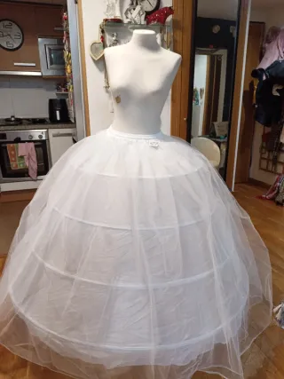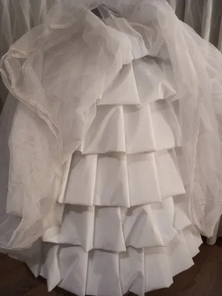 Este cancan de fallera aporta volumen y forma al vestido. - Color blanco. - Talla L / 40 / 12. Lleva tirantes y bolsillo Se ajusta con corchetes