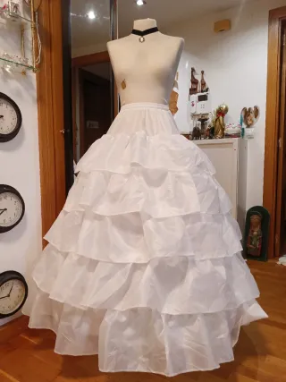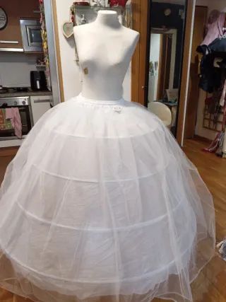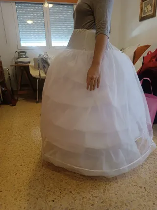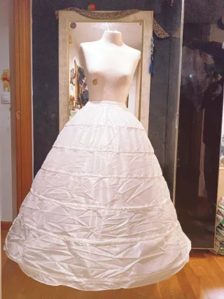 Cancán ahuecador para traje de fallera – Súper volumen desde la cintura Vendo cancán ahuecador con mucho volumen desde la cintura. Lleva 6 aros de acero flexible de 1 cm, que se pueden regular para dar más o menos vuelo según se quiera. Es fuerte y resistente, aguanta mucho peso sin deformarse, incluso con dos faldas juntas. Lleva capa de tul, cintura elástica con corchetes y además cuerdas para ajustar mejor. 📏 Largos disponibles: 80, 85, y 105 cm 📐 Tallas de cintura: desde la 34 hasta la 64 Se guarda en pack, muy práctico. (Temporalmente no disponemos de fundas) Está sin estrenar.