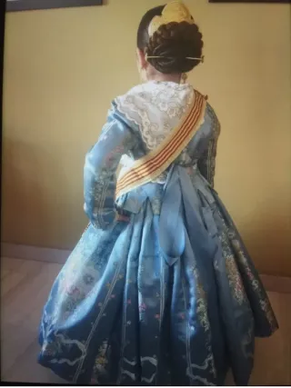 Traje de fallera con un diseño vibrante y detallado. Ideal para celebraciones. - Tejido principal en azul con motivos florales. - Detalles bordados en contraste. - Adornos de encaje en cuello y mangas.