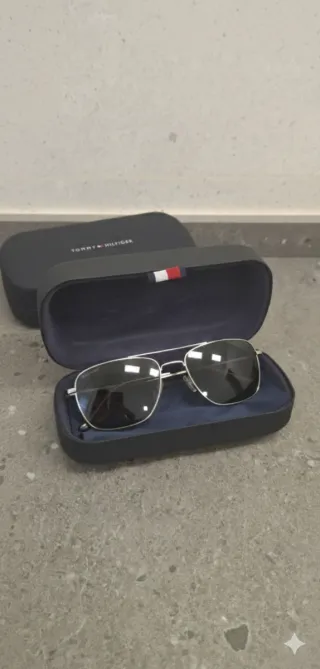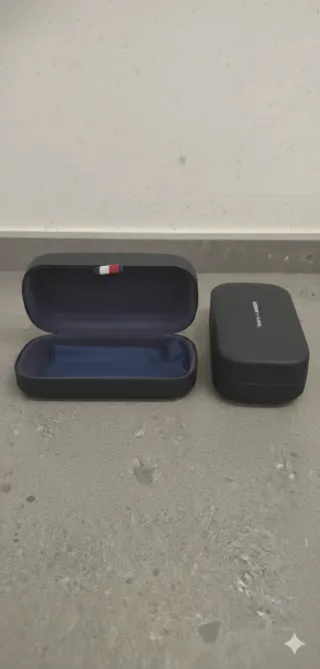 Estuche para gafas de la marca Tommy Hilfiger. - Color exterior negro. - Detalle de banda multicolor en la tapa. - Interior forrado en tela azul. Paea gafas, como estuche de bolis etc