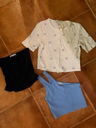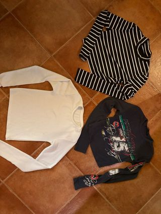 Lote de tops para niña. - Top blanco con textura manga larga - Top de rayas blancas y negras manga larga - Top oscuro con estampado gráfico manga larga -Top blanco con flores, botones manga corta -Top negro sin manga -Top azul, tirantes en un hombro - Dos vestiditos tirantes, azul claro con flores y negro brillante. No vendo por separado. Lote €12,50