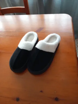 Comodísimas zapatillas de estar por casa, perfectas para relajarse. - Exterior de ante sintético negro. - Forro interior blanco de pelo sintético.