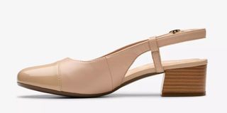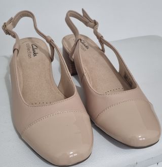 Elegante zapato de tacón bajo con un diseño combinado. Modelo Marilyn rose - Tacón de bloque con acabado de madera. - Punta reforzada en charol. - Correa de tobillo ajustable con hebilla.