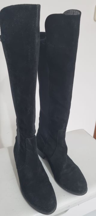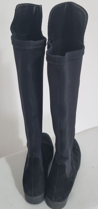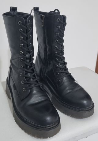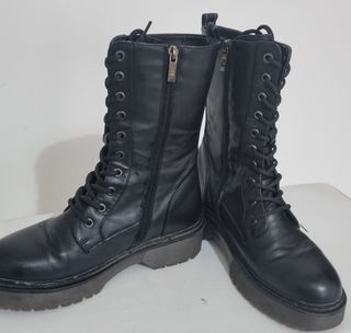 Botas altas de estilo motero para mujer. Cuentan con un diseño moderno y versátil. Caña 19cm, cremallera interiro, altura tacón 5cm. Suela gruesa y resistente, perfectas para invierno o looks urbanos. En buen estado general, con desgaste normal por el uso. - Cierre de cordones. - Cremallera lateral. - Suela gruesa y resistente.