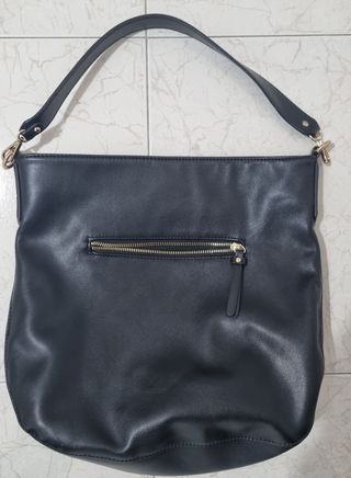 Bolso negro de piel sintética con un diseño moderno y versátil. Medidas 32*35*12 - Cierre cremallera. - Asa ajustable. - Detalle metálico dorado en la parte frontal.