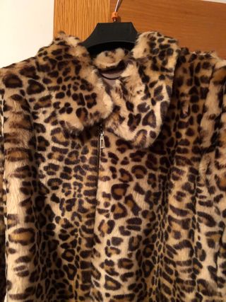 Chaqueta de pelo con estampado de leopardo, ideal para añadir un toque salvaje a tu look. Es suave y cómoda. - Diseño de leopardo. - Cierre de cremallera dorada.