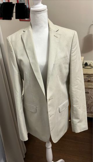 Elegante traje de hombre. - Diseño clásico de solapa. - Cierre de un botón. - Bolsillos frontales. - Pin decorativo en la solapa. Solo necesita plancha, está limpio de tinte.