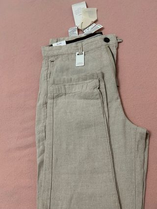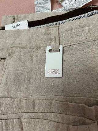 Pantalón de corte slim confeccionado en lino. - Tejido ligero y transpirable. - Cintura con trabillas. - Cierre de cremallera y botón. - Bolsillos laterales.