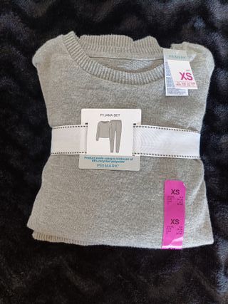 Conjunto de pijama gris de Primark nuevo. El tejido está hecho con un mínimo de 50% de poliéster reciclado. - Talla XS (UK/IRL 6-8, EUR 34-36, USA 2-4, IT 38-40). - Incluye camiseta de manga larga y pantalón largo.