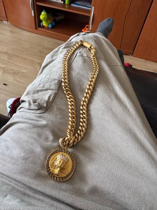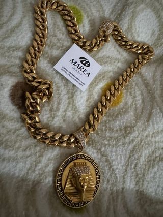 Elegante cadena cubana con un llamativo colgante con diseño de faraón. - Baño de oro de alta calidad. - Colgante con detalles de circonitas. - Cierre seguro y robusto. - Tambien cambio por algo de mi interes