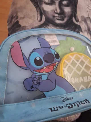 Neceser transparente con diseño de Stitch y el lema Ohana y monedero de piña. - Personaje: Stitch de Disney. - Diseño: Estampado Ohana y detalles de piña. - Material: Plástico transparente y tela. - Neceser y monedero de Stitch de Disney. - El neceser es de color azul y el monedero amarillo, ambos con un diseño precioso. - Monedero amarillo con forma de piña con las letras Ohana en blanco.