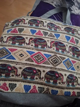 Bolso con un llamativo estampado étnico de elefantes y motivos geométricos. - Diseño con múltiples filas de elefantes. - Patrones geométricos en forma de rombos y triángulos. - Asas de tela resistentes. - De nylon con cremallera y bolsillo interior, por detrás liso gris. - Gran capacidad. - Medidas 40 cms x 32 cms.
