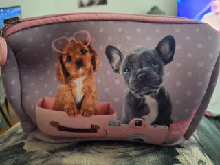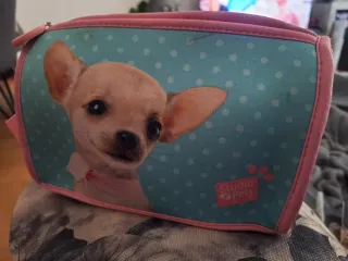 Neceser con un adorable diseño de cachorros de Studio Pets. - Estampado de lunares. - Cierre de cremallera. - Neceser o estuche de Studio Pets, reversible, con diferentes perros en cada lado. - Muy poco uso, muy buen estado!