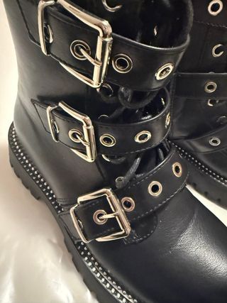 Botas de corte alto con un diseño moderno y atrevido. - Cierre con cordones. - Múltiples hebillas metálicas decorativas. - Detalle de tachuelas en la suela.